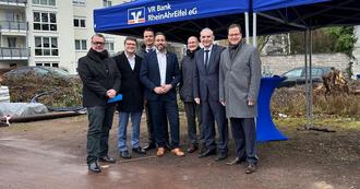 Jens J. Ternes (Architekt), Oliver Engels (Regionalmarktdirektor), Angelo Breiing (Filialleiter Andernach), Christian Greiner (Oberbürgermeister), Michael Hessel (Bereichsleiter; zuständig für das Dienstleistungszentrum Immobilien), Claus Peitz (Bürgermeister) und Markus Müller (Vorstand) (v.l.n.r.)