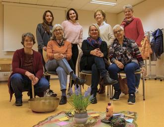 Entspannungspädagogin und Stressmanagement-Trainerin Sabine Papirny-Baumgarten (v.l.) mit den Teilnehmerinnen des Kurses "Entspannt in den Feierabend"