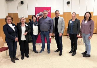 Die Vorstandsmitglieder der FU v.l.n.r. Ursula Eisl, Dr. Hedda von Wedel, Annette Weiß, Anja Langenbahn und Ulrike Schmitz freuen sich mit Christian Greiner und Ortsvorsteher Andreas Lehmann , der die Räumlichkeiten in Eich zur Verfügung stellte, über einen interessanten Abend.