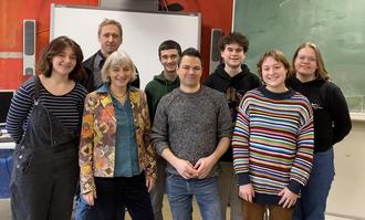 Meterologe Özden Teril (Mitte) mit Christiane Bals (3.v.l.) und dem Team der Berufsorientierung am BvSG