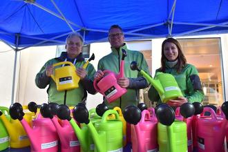 Gut gelaunte Mitarbeiter der Stadtwerke verteilten farbenfrohe Gießkannen.
