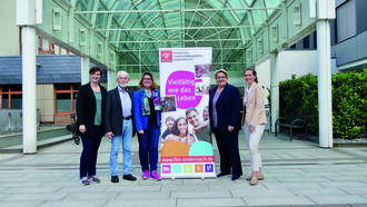 Die Kooperation unterstützen tatkräftig (v.l.n.r.): Sabine Seninger (Leiterin Elternschule), Paul Meyer (Vorsitzender des Vorstandes der Familienbildungsstätte), Stefanie Lange (Leiterin Familienbildungsstätte), Cornelia Kaltenborn (Geschäftsführerin), Leonie Hain (kfm. Leiterin St. Nikolaus-Stiftshospital)