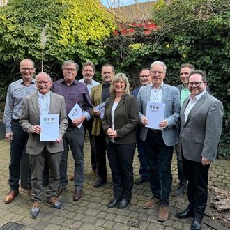 Verbandsvorsteher Pascal Badziong (r.) dankte zusammen mit der stellv. Verbandsvorsteherin Anke Beilstein (Mitte) und Mitgliedern der Geschäftsführung sowie des Beirates den ausgeschiedenen Mitgliedern der Verbandsversammlung Klaus Bell, Ernst Einig, Norbert Leimbach sowie Hans-Joachim Mons (mit Urkunde).