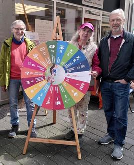 Der Weltladen Andernach hatte zum Weltladentag eingeladen. Ein Glücksrad mit den 17 Zielen für nachhaltige Entwicklung regte an, sich spielerisch mit den Themen zu beschäftigen. Sabine Schmitz, Weltladen (2. v. re.); sowie die Initiatoren des Glücksrades Peter Schmitz (1. v. re.), Günter Leisch (3. v. re.); Foto: Gabi Schmitz