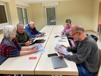 Mitglieder des Vorstandes beim Betrachten des druckfrischen Heftes.
