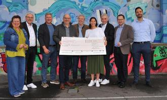 Der SPD-Stadtverband mit seinem Vorsitzenden Udo Dames (4. von links) überreichte den Spendenscheck in Höhe von 650 Euro an Bürgermeister Claus Peitz (3. von rechts) und Stadtjugendpflegerin Janine Müller (4. von rechts). Mit dem Geld werden Kinder- und Jugendprojekte im Jugendzentrum unterstützt.
