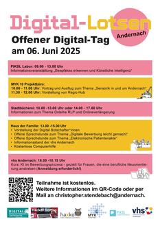 Die Digital-Lotsen Andernach laden am 6. Juni 2025 zum zweiten Mal alle Interessierten zu einem offenen Tag ein. An diesem Tag haben Groß und Klein die Gelegenheit, die vielfältigen Angebote und Projekte kennenzulernen, mit den Digital-Lotsen persönlich ins Gespräch zu kommen und die vielfältigen Möglichkeiten der digitalen Welt zu entdecken. Es wird eine Vielzahl von Veranstaltungen rund um digitale Themen und Technologien angeboten.