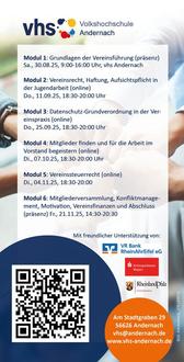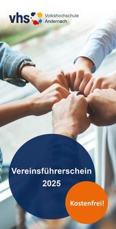 Aufgrund ihrer gesellschaftlichen Rolle und ihres großen Beitrags zum kulturellen und gesellschaftlichen Zusammenhalt bietet die Volkshochschule (vhs) Andernach erstmals den Vereinsführerschein an. Die Fortbildung ermöglicht es Vereinsvertreterinnen und -vertretern, sich zukunftsgerecht aufzustellen. Ebenso wird mit Vorbehalten in Bezug auf die Übernahme eines Ehrenamts aufgeräumt und mehr Sicherheit in der Amtsausübung vermittelt. Auch ist die Teilnahme von Personen oder Gruppen möglich, die die Gründung eines Vereins in Erwägung ziehen und sich vorab über Abläufe und Rechtsvorschriften informieren möchten.