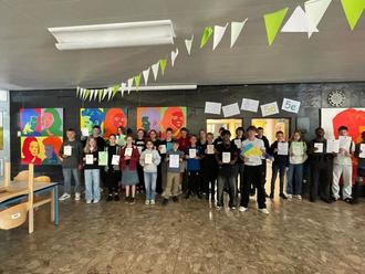 Am 06.06.2025 fand in der sechsten Stunde in der Eingangshalle der Geschwister-Scholl-Realschule plus die Siegerehrung für die diesjährigen Bundesjugendspiele statt. Eingeladen waren nicht nur alle Gewinnerinnen und Gewinner einer Ehrenurkunde, sondern auch die erfolgreiche Leichtathletik-Jungenmannschaft U 16 der Schule. Diese war nur drei Tage zuvor Regionalmeister geworden und darf Ende Juni am Landesfinale teilnehmen. Alle Jungs des Teams erhielten von der Schulleiterin, Linda Pfannschmidt, ein Exemplar der Siegesurkunde.