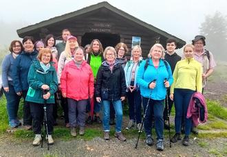 Die Wanderführer Winfried Berlin und Doris Bell führten die Gruppe auf einem leicht ansteigenden Weg hinauf zum 540 m hohen Köppel. Leider war eine Aussicht auf die Weiten des Westerwaldes nicht möglich, denn es herrschte neblig trübes Wetter, und die Sonne schaffte es an diesem Tag nicht, den Nebel zu vertreiben.