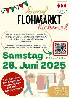 Am Samstag, den 28.06.2025, verwandelt sich Nickenich in ein Paradies für Schnäppchenjäger und Flohmarktfreunde. Von 11:00 Uhr bis 17:00 Uhr findet der 1. Dorfflohmarkt in Nickenich statt, bei dem weit über 100 Aussteller in ihren Höfen, Garagen und Vorgärten zum Stöbern und Entdecken einladen.