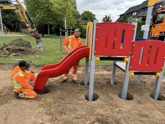Mitarbeiter des Baubetriebshofs Andernach auf dem Spielplatz an der St.-Amand-Straße