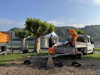Mitarbeiter des Baubetriebshofs Andernach auf dem Spielplatz in den Rheinanlagen