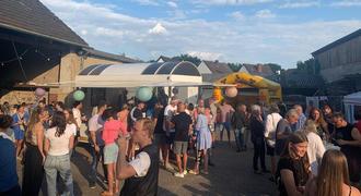 Auch der Basteltisch des Schöffenstuhls mit Minionmasken und Blumenkränzen war sehr gut besucht. Am späten Nachmittag füllten sich die große schön dekorierte Scheune und der Hof immer mehr und Spießbraten mit Krautsalat und Würstchen vom Grill wurden heiß begehrt. Auch an Vegetarier wurde mit vegetarischer Grillwurst und Käsebrötchen gedacht. Besonders der Bierstand war bei dem warmen Wetter gut belagert und jeder freute sich über ein frisch gezapftes kühles Bier.
