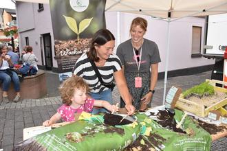 Natürlich gab es ebenso für die jungen Besucher viel zu erleben wie etwa am Mitmachstand der Permakultur in Zusammenarbeit mit Presto Humus beim Eintopfen von kleinen Salatpflänzchen, Dosenwerfen oder Angeln. Zudem offerierten Stadtwerke und Haus der Familie Popcorn, Obstsalat oder Melonenstücke zur Erfrischung.