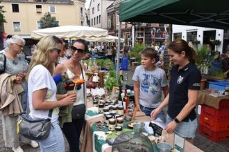 Bei dem großen Fest in der Innenstadt, zu dem die Einzelhändler bei einem verkaufsoffenen Sonntag auch noch mit Summersale-Schnäppchen lockten, stand alles unter dem Zeichen des nachhaltigen Genuss und der Regionalität. An zahlreichen Marktständen informierten Anbieter über Produkte des nachhaltigen Anbaus, Hofläden mit regionalen Erzeugnissen oder auch Gastronomen, die Speisen mit Zutaten aus der Region verwenden. Meist konnten die Produkte zuvor getestet werden wie zum Beispiel Brotaufstriche, Käse oder Kirschen.
