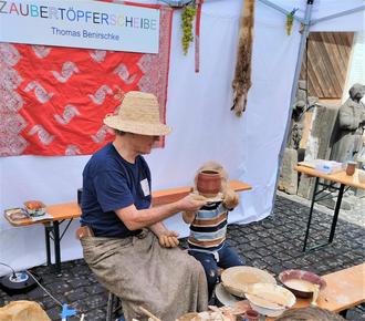 Für Groß und Klein gab es bei Kaiserwetter auf dem Museumshof Geschichte zum Anfassen und Ausprobieren: Angefangen bei der Aufbereitung des Tons, über das Formen der Gefäße mit den Händen auf der rotierenden Scheibe, bis hin zum Verzieren der Keramik mit Pinsel und Kamm ließ der bekannte Keramik-Künstler Thomas Benirschke das Publikum die Herstellung von Keramikgefäßen hautnah miterleben.