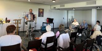 Mitsingen und gute Laune. Mit Thomas Pinger und seinem Akkordeon erlebten die Senioren des Altenzentrums St. Stephan einen kurzweiligen Nachmittag, unterstützt durch die Heinz-Gries-Stiftung. Foto: Diana Petrek