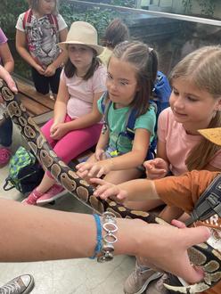 Um 12 Uhr gab es eine Überraschung für die Kinder: eine Zooführung. Das große Highlight für die Kinder war es, eine Schlange aus der Nähe betrachten zu können und, für einige mutige Kinder, sogar diese anzufas-