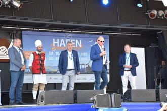 Der technische Geschäftsführer der Stadtwerke Jan Deuster (1.v.l.) sowie Bürgermeister Claus Peitz (3.v.l.), Oberbürgermeister Achim Hütten (4.v.l.) und der kaufmännische Geschäftsführer Lars Hörnig (1.v.r.) begrüßen die Gäste beim Sommerfest am Hafen. Auch die Bäckerjungen sind mit dabei.