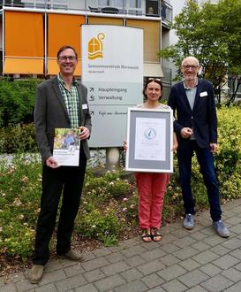 Freuen sich über die erneute Auszeichnung mit dem Grünen Haken: Einrichtungsleiter Hans-Peter Mayer, die stellvertretende Pflegedienstleiterin Margarete Wieczorek und Prokurist Jürgen Schmidt.