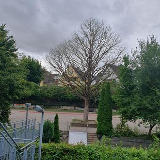 Nach dem starken Hagel im vergangenen Jahr trägt sie kein Laub mehr und hat sich von Begutachtung zu Begutachtung in der Vitalität verschlechtert. Es besteht eine sehr stark ausgeprägte erkennbare Wipfeldürre und der Baum ist nach Aussage der Fachleute in einem unaufhaltsamen Prozess des Absterbens.
