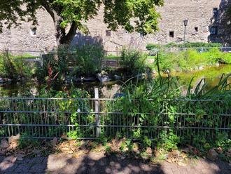 Andernach. Der Teich am Stadtgraben mit viel Grün, Enten und Fischen ist ein Ort der Naherholung mitten in der Stadt. Viele Familien nutzen den Weg entlang des Teiches und die Bänke zum Schauen und Rasten.