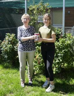 Stolz überreicht Carla die gut gefüllte Spendendose an Dorothee Schünemann-Diederichs.
