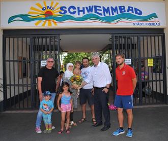 Bürgermeister Claus Peitz (2. von rechts), Christoph Hennecke (rechts), Meister für Bäderbetriebe, und Betriebsleiter Bodo Neunheuser (links) konnten mit Thabet Charbo, der mit seiner Familie in Freibad kam, den 40.000. Besucher in diesem Jahr begrüßen.