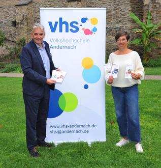 Bürgermeister Claus Peitz und die Leitern der vhs Andernach, Julia Dormayer, präsentieren das neue vhs Programm zum Semesterstart.