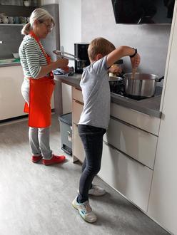 Die ehrenamtlichen Helferinnen Manuela Schönfeld und Sandra Schluchtmann standen beim Kinder-Kochkurs zur Seite und verrieten einige Kniffe. Ganz wichtig ist es, beim Kochen immer in der Küche zu bleiben und nichts anderes zu tun. Zu schnell ist das Essen angebrannt und kann nicht mehr gegessen werden.