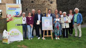 Die Klima-Werkstatt der Ehrenamtsinitiative hat ein Klima-Quiz veranstaltet. Die Gewinner erhielten aus den Händen vor Oberbürgermeister Christian Greiner (4. von links) und Peter Schmitz (3. von links) von der Klima-Werkstatt jetzt ihre Preise.