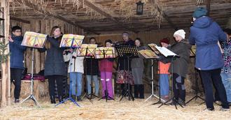 Während ein eisiger Wind über das Weihnachtsdorf fegte, gaben die jungen Musikerinnen und Musiker im Stall der „Lebenden Krippe“ alles, um ihren empfindlichen Instrumenten wohlklingende Töne zu entlocken. Über die musikalische Bereicherung freute sich auch Thomas Manstein, Spielleiter der „Lebenden Krippe“. Er bedankte sich bei den jungen Musikern und Dr. Monika Burzik, Leiterin der Kreismusikschule, und lud diese kurzerhand dazu ein, das Weihnachtsdorf auch im kommenden Jahr musikalisch zu begleiten. Er hoffe dabei auf etwas mildere Temperaturen. Denn an diesem Samstag lagen sie im zweistelligen Minusbereich. Dass insbesondere Blechblasinstrumente auf Kälte sehr empfindlich reagieren und schwer zu spielen seien, wisse er aus eigener Erfahrung, zollte Manstein den Nachwuchsmusikern großen Respekt. Diese gaben trotz klirrender Kälte auf der Bühne alles, um das Publikum im Weihnachtsdorf mit fröhlichen Weihnachtsliedern in festliche Stimmung zu versetzen.