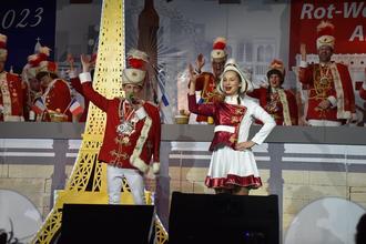 Ein beleuchteter großer Eifelturm war im Zentrum der Bühne zu sehen: Die Husaren nahmen an zwei Abende bei ihren Prunksitzungen mehrere Hundert Jecken in Bestlaufe mit auf eine wunderschöne Traumreise nach Paris.