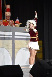 Dies hatte auch mit einem der folgenden Programmpunkte zu tun: Schon als die neue Regimentstochter seitlich am Bühnenvorhang zu sehen war, kamen viele laute „Katharina“-Rufe aus dem Publikum. Nicht ohne Grund, wie Katharina Versch bei ihrer rasanten Schau zeigte, die unter anderem mit einem flotten Sprung in den Spagat aufwartete. Dafür erntete sie viel Jubel sowie Applaus und noch einmal eine Rakete, als Michael Steil ihr für ihr Engagement als bisheriges Solomariechen seit dem Jahr 2012 dankte und leider ihren Abschied in dieser Position ankündigte.
