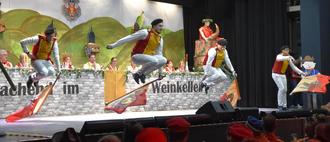 Einen Vorabgeschmack dafür gab es schon zu Beginn, als sich der Vorhang öffnete: Hut ab für den Bühnenbau! Der Elferrat thronte auf einer für die Region typische Bruchsteinmauer mit der Aufschrift „lachend im Weinkeller“. Im Hintergrund waren Weinberge mit Reben und Trauben zu sehen. Aus einem Weinfass lugte ein mit Lorbeeren Bekränzter heraus, der ein Trinkhorn ausgoß, eine Anspielung auf die Römer, die den Wein in die Region gebracht hatten.
