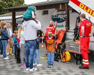 Nach Begrüßung der Gäste gaben der Vorsitzende Erik Müller und Michael Seimetz, Leiter Einsatz und Ausbildung, einen kurzen Überblick über die Aufgaben und die Einsatzgebiete der DLRG. Im Anschluss ging es für die jungen Entdecker und Entdeckerinnen in kleinen Gruppen zu den einzelnen Fachbereichen der Wasserrettung: Tauchen, Strömungsrettung, Boote, Fahrzeuge, Gerätewagen Sanität (GW-SAN) und Realistische Unfall- und Notfalldarstellung (RUND).
