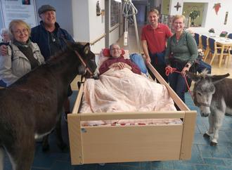 Außergewöhnlicher tierischer Überraschungsbesuch in der Altenzentrum-Sankt-Stephan-Stiftung. Von links: Esel Pepper, Marianne Bach, Hans Signer, Peter Bach, Tierpfleger Remco, Gerline Bach, Esel Rosa.