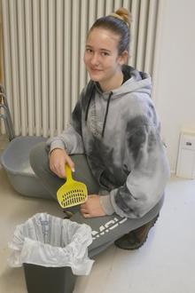 Kala ist dort keine Unbekannte. In den Sommerferien sammelte sie mit der Spendendose des Tierheims einen Betrag von fast 250 Euro ein. Schon vom ersten Tag an war klar, dass man sich auf Kala verlassen kann. Nach dem Reinigen der Katzenzimmern, der Gehege der Kleintiere oder der Unterkünfte der Hunde glänzte alles wieder hygienisch rein.