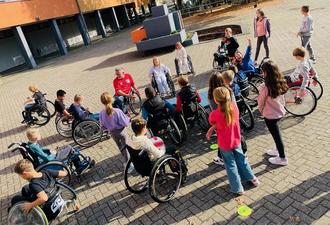 Anschließend durften die Schüler auf dem Schulhof das Fahren mit den bereitgestellten Rollstühlen ausprobieren. Mit Begeisterung meisterten sie verschiedene Disziplinen, wie z. B. Vorwärts- und Rückwärtsfahren, Slalomfahren, verschiedene Hindernisse bewältigen und das Wenden mit dem Rollstuhl. Viel Freude hatten die Schüler beim abschießenden Rollstuhl-Rennen.