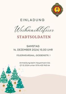 Am 14. Dezember findet die alljährliche Weihnachtsfeier der Stadtsoldaten Andernach statt. Los geht es ab 15:00 Uhr im Feuerwehrsaal in der Goebenstraße 1. Der Vorstand hat wie immer ein kleines Rahmenprogramm vorbereitet, auch der Nikolaus wird der Stadtsoldatenfamilie traditionsgemäß einen Besuch abstatten. Um Anmeldung zwecks besserer Planung wird gebeten bis zum 07.12.2024 bei Hauptmann Thomas Bell unter 0176/43396364.