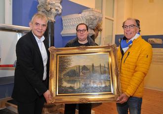 Der Amtmann der Martinsberg-Nachbarschaft, Alfred Severin (rechts), überreichte das Gemälde des Andernacher Malers Wilhelm Bittner, das aus dem Jahr 1902 stammt, an Bürgermeister Claus Peitz (links) und Museumsleiter Dr. Kai Seebert.