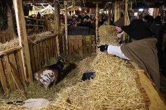 Ziegen und Esel in der Krippe dürfen gestreichelt werden.