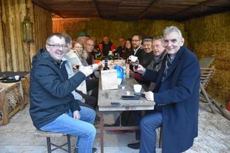 Richtfest der Krippenbauer mit Spielleiter Thomas Manstein (links). Auch Bürgermeister Claus Peitz freute sich über die fertig gebaute Krippe