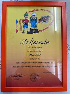 Mit großer Freude nahm Zugführer Oliver Becker die Gründungsurkunde von Peter Meffert, dem Vertreter der Bambinifeuer im Landesfeuerwehrverband, entgegen.