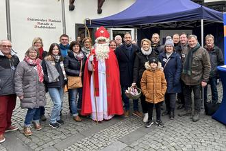 Die Mitglieder der Freien Wählergruppe samt Nikolaus an ihrem Stand vor dem historischen Rathaus.