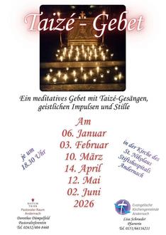 Einmal im Monat lädt der Pastorale Raum Andernach und die Evangelische Kirchengemeinde zu einem meditativen Abendgebet in die kerzenerleuchtete Hospitalkirche ein. Es ist gestaltet im Stil des Taizé-Gebets mit meditativen Gesängen, geistlichen Impulsen und Stille.