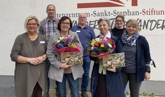 Die Entwicklung des Altenzentrums St. Stephan über mehr als 35 Jahre mit begleitet. Beatrix Oster (3. von links) und Elisabeth Nestmann (3. von rechts) wurden in den Ruhestand verabschiedet. Es bedankten sich (von links): Vorstandsvorsitzende Carmen Mitscher, Vorstand Thomas Weber, Georg Breit (Einrichtungsleitung), Vorstand Diana Petrek und Anna Jost (Einrichtungsleitung)