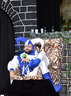 Bestens unterhalten konnte ebenso die Riege der Vortragenden, die mit Janos Käfer als „Till“ den Anfang nahm. Dieser räkelte sich zwar auf einem Sessel, doch trügte dieser lockere Eindruck, denn er verschoss seine gereimten Wortpfeile spitz, treffend und ohne einmal auf ein Blatt zu schauen, in die verschiedensten Richtungen wie etwa die Andernacher OB-Wahl, das englische Königshaus, die Entgleisungen der Klimaaktivisten, überhöhte Abgeordneten-Diäten oder die WM in Katar.