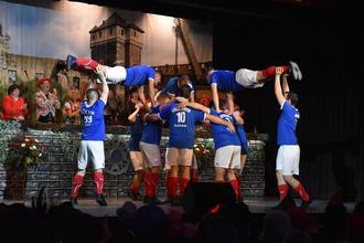 Mit dem Blick auf die SG und die zurück liegenden Fußball-Ereignisse kamen die Männer vom Männerballett (Trainerin: Christina Scharnbach) als Kicker in den Saal, natürlich – gemäß den Farben der Garde in blau-weiß-roten Outfits.